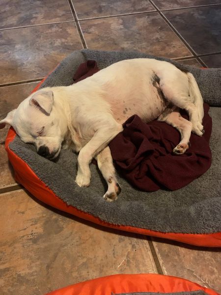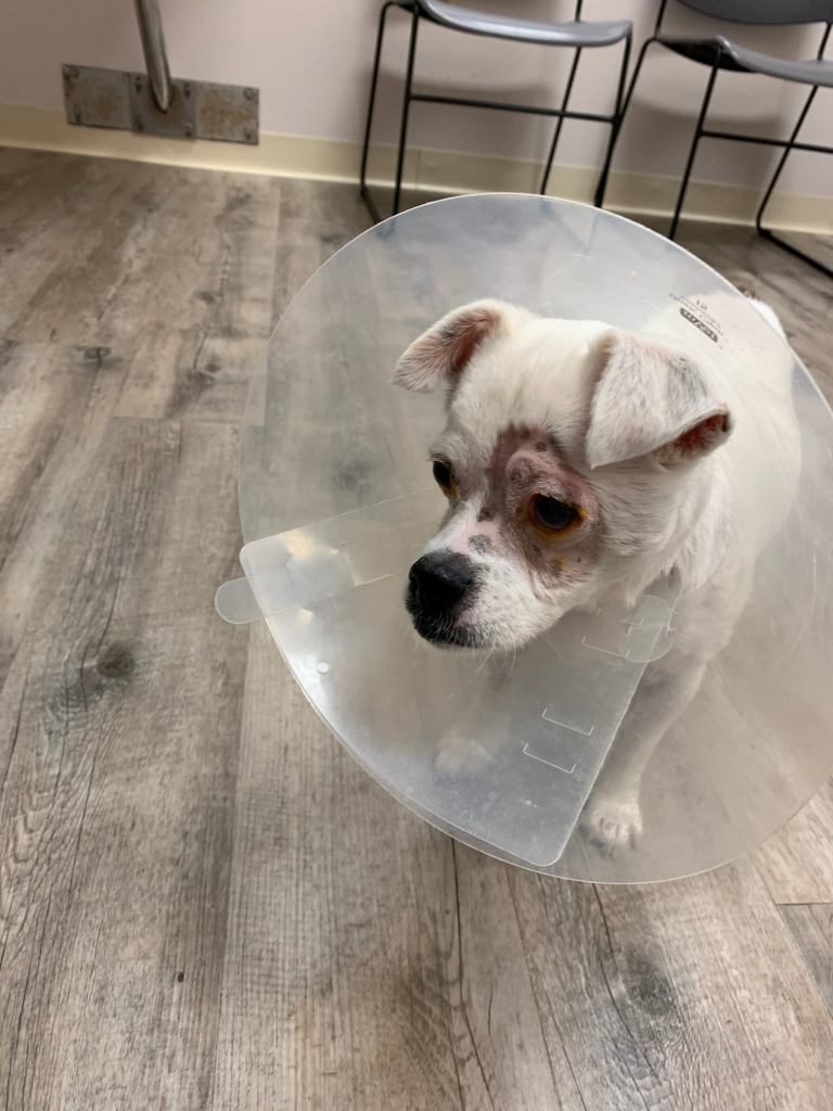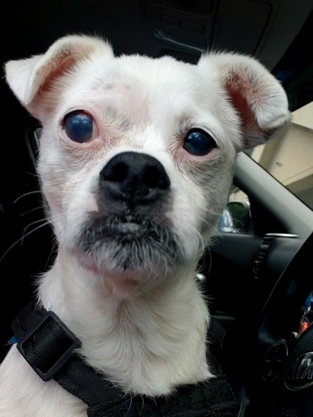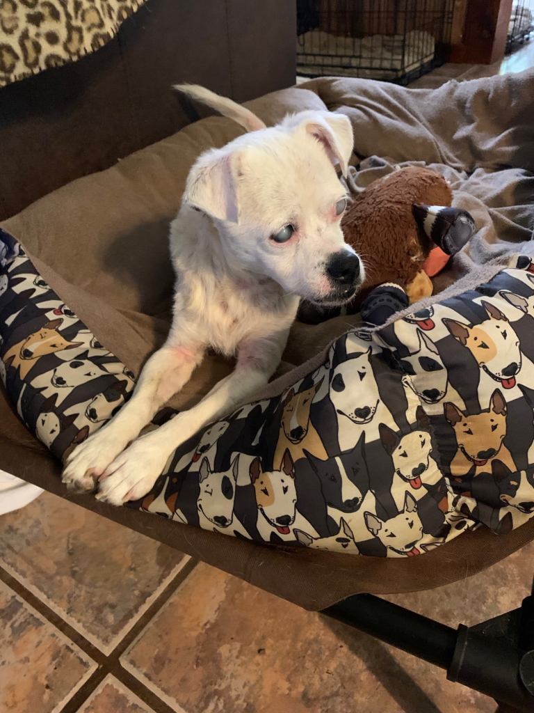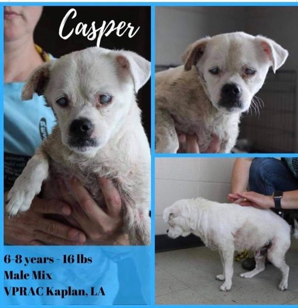 I was notified about Casper and asked if he could come to us. I was told he had a bad neck wound (seemed to be from another animal), was blind, seemed older than posted and no one wanted him. So, he joined our little family on June 24.His exam at vet was really good. He was younger than first thought. He did not even need a dental….vet rare for any I take in. The wound on his neck was almost healed. He had no medical problems…all good organs. And he had some vision impaired only by cataracts. He did have a bacterial skin infection which responded well to medicated baths.Once here he was very shy and kept to himself. I suppose after his experience he may have been intimidated by living with many other dogs.Once his skin was better he was examined by Dr. Van Brunt, the eye specialist. He had his cataract surgery and recovered beautifully. And he was so good getting all the eye drops…5 meds, four times a day.After his last post op check up a sister rescue asked to take him over. Well, my dear friend, Stephanie, who has been so helpful in getting the pups to Mandeville appointments when she can, found a wonderful foster who is also a vet tec who will take over his care. He left for a new life yesterday afternoon. Tired Dog Rescue in Gulfport will find him a wonderful forever family. Casper is a wonderful little baby. He’s about 15#, maybe around 6 years and sweet and quiet as could be. He was just begining to wag his tail and make his way around a bit. It was so rewarding to see him regain his sight. Please check out TDR FB page if you may be interested in adding him to your family.