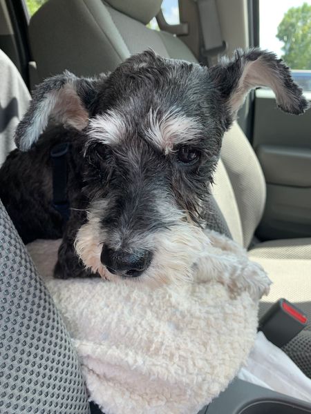 Mollybeth is a new baby. We’ve had her since the end of June. She is an older girl, in poor shape, who was surrendered to the city shelter to be euthanized. Rosie’s medical foster alerted me to her and asked to pull for us. I agreed on the condition that she would foster Molly. And so another has joined our little family.Thanks to Dr. Donna Kleinpeter, our most adored, capable and cooperative vet, Molly had a good exam and discovered multiple problems. She’s 9 years, blind, bad skin, bad teeth, bladder stones and suspected Cushing’s (turned out to be a borderline case). She also has some GI issues. She had her bladder surgery and a dental. Then saw our eye specialist (severe, untreated dry eye) and seems to have some vision…no surgery required. Her skin has responded well to treatment. She is still with Leslie, her medical foster and is doing much better. There has been a need to see our vet several times but are getting on top her problems as they arise. She is now on a special diet, probiotics, and Reglan for her GI problems and bladder care. She’s on daily eye drops and is still getting skin care. She’s a very sweet, loving girl who loves being right by her person.
